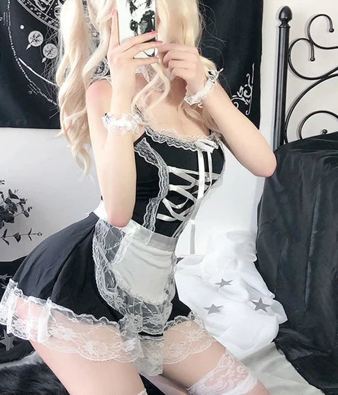 Designed with slightly stretchy fabric, our dress offers a comfortable fit, ensuring you feel confident and alluring all day long. The dainty ruffled skirt and apron around the waist add an extra touch of charm, enhancing your adorable appearance.