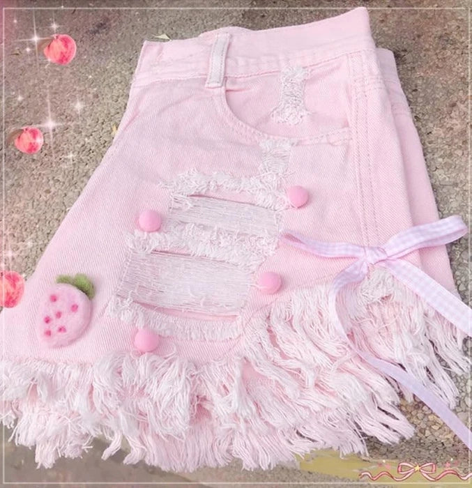 Made from high-quality denim material with a touch of stretchiness, these denim jean shorts offer both durability and comfort. The soft and silky pink ribbons add an extra touch of sweetness, while intentional rips and distressing give them a trendy edge. Don’t miss the adorable little fuzzy strawberries that adorn these shorts, making them the epitome of pink princess perfection!